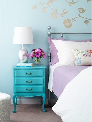 A pair of three-drawer sidetables in turquoise flank the bed and are a brilliant addition. The key here is to have the table’s color be a few shades darker than the wall {Benjamin Moore’s Bird’s Egg} so that there is some contrast. The silver table lamp coordinates beautifully with the bedframe.