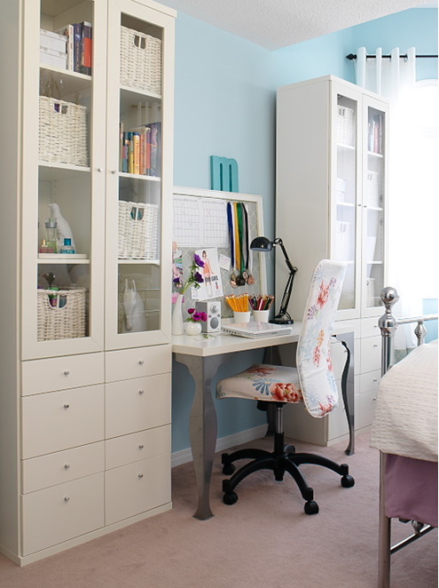 Here Austin maximizes the room’s vertical space by using two tall cabinets that provide additional storage. The desk is beautifully positioned in between to balance the look. The desk chair is slipcovered in a darling floral print that is repeated in the bed and chair pillows.