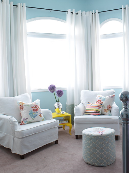 This darling girl’s room was designed by Austin. She combines blues, lavender and white to create a cool, yet inviting color palette. The crystal chandelier, floral throw pillow and painted floral motif above the bed {wall decals from Ikea} gives the space a feminine feel.