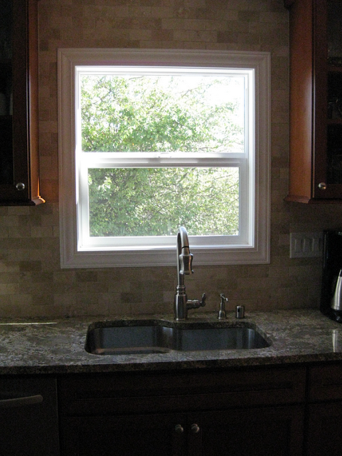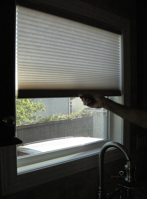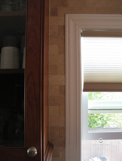 Simple Fit custom shade. As it turns out, I was helping a client select fabric for window treatments and bench seating in their kitchen nook. The window above the main sink {image below} gets direct morning sunlight, was blinding my clients and was still in need of a window covering. The homeowners opted not to have a custom fabric Roman shade, but instead wanted a simple cellular shade.