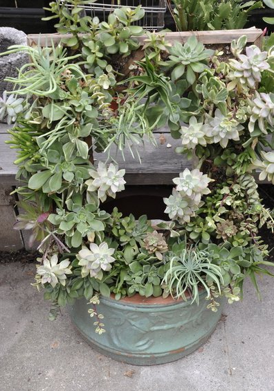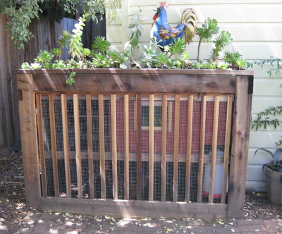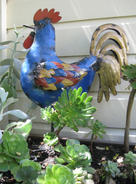 My friend planted drought tolerate succulents in her roof garden, but a veggie garden would be fun if enough sunlight. I love the rooster ornament – many municipalities ban the real ones, but don’t worry hens lay eggs without them.