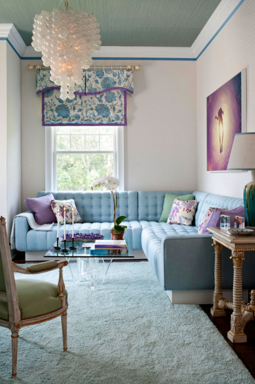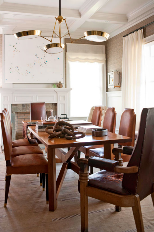 What I love: The ceiling covered in teal grasscloth and the 1960s Venini glass chandelier.