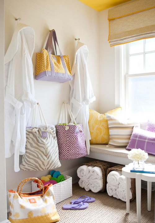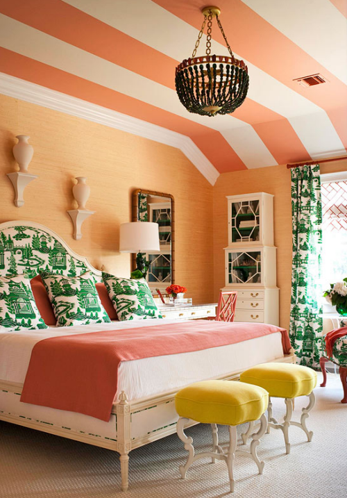 What I love: The jade green, coral and chartreuse color scheme and bold stripe on the ceiling.