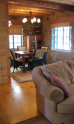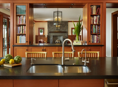 Designed by Elizabeth Dinkel, this kitchen’s glass-front cabinets house books and frame an open window into the adjacent living room.