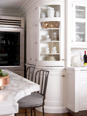 This curved glass display case is beautifully positioned on a corner. Love this use of space! Image via Kitchen Bath Ideas.