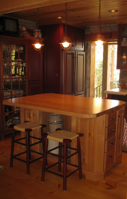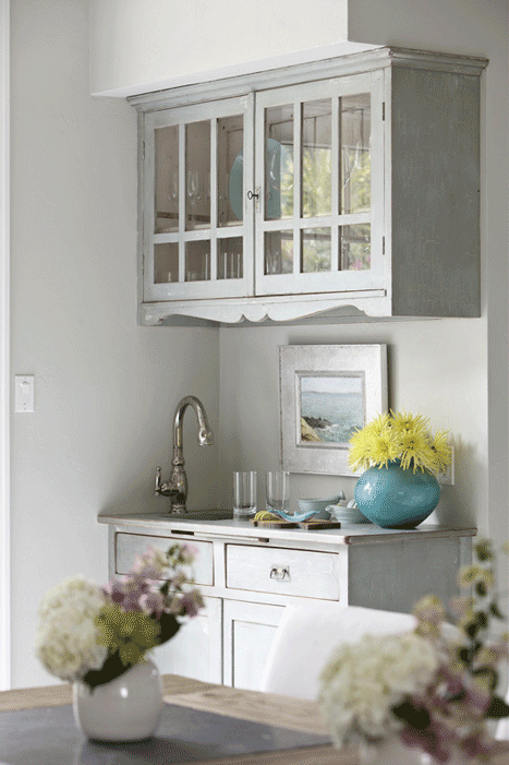 In this kitchen, designer Molly Frey converts an antique hutch from New England into a wet bar. The glass-front cabinet in this case doesn’t have to match the kitchen’s cabinet style and adds to the overall charm by mixing old and new.