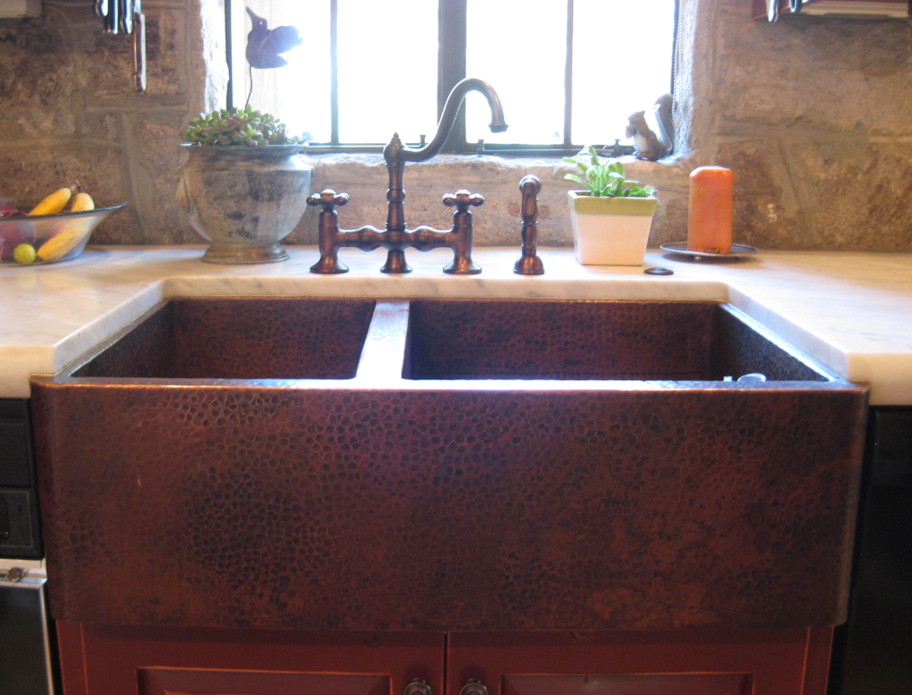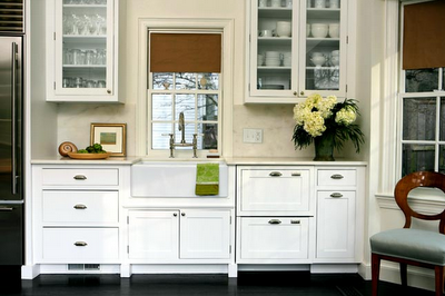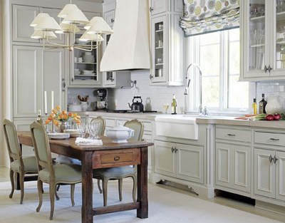 Atlanta, Georgia-based designer, Suzanne Kasler beautifully positions glass-front cabinets on either side of the stove and farmhouse sink. Love the Roman shade in Galbraith & Paul’s Zinnia print.