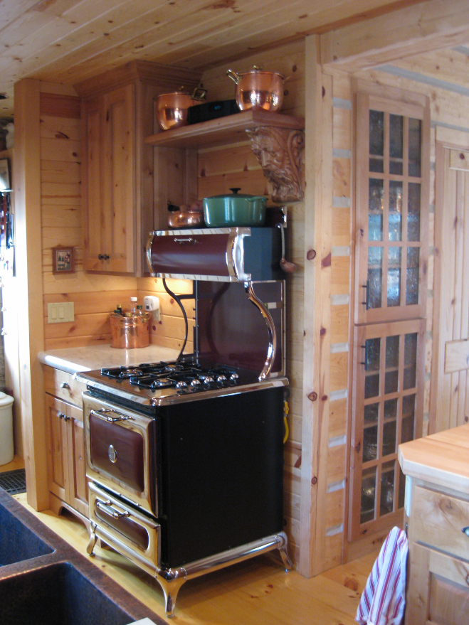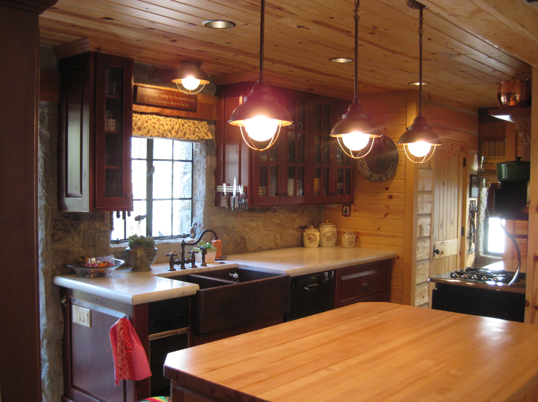 Sage Design uses glass-fronts in a series of standard rectangle shaped cabinets to give this smaller, classic kitchen an open and airy feeling.