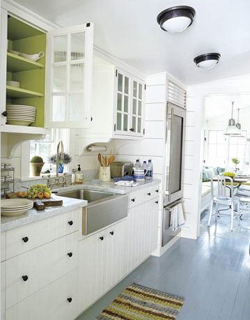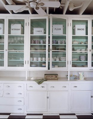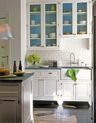 Painting the back or interior of a glass-front cabinet allows you to add a shot of color into your kitchen. Select a hue that complements your existing color scheme and is a contrast to your tableware. Image via House Beautiful.