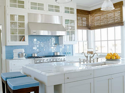 Natural light floods this gorgeous kitchen by designer, Suzanne Kasler. She surrounds a range and hood with divided light or mullioned door glass-front cabinets. The cabinets also nicely echo the look of the adjacent windows. The ice blue tile backsplash and bar stools add a touch of freshness to this beautiful kitchen.