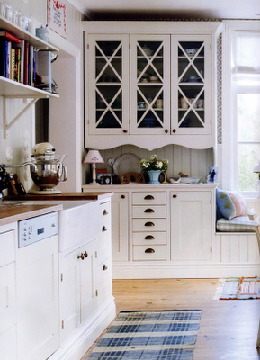 In this Scandinavian kitchen from Vakre Hjem & Interior, the divided light glass-front cabinets are stunning. The X pattern contrasts nicely with the vertical pattern in the country beadboard.