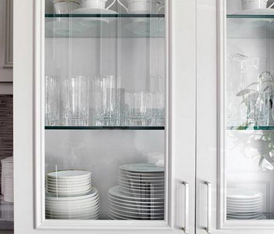 Featured in the August 2007 issue of House Beautiful, the interior of these divided light cabinets are painted by architect Gil Schafer and color consultant, Eve Ashcraft. Both the white cabinets and china contrast nicely with the apple green backdrop. The glass insert appears to be reeded which would help conceal the cabinets contents.