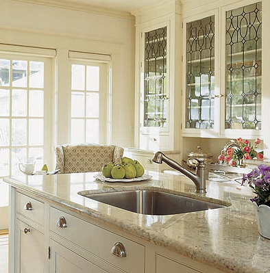 In this soft cream kitchen the upper cabinets showcase decorative stained glass. I am a fan of mixing old with new and love how the stained glass old world look balances the contemporary design elements. Image via Decor Pad.