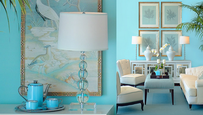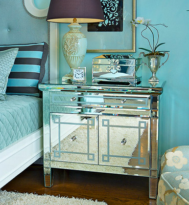bedroom showcased a beautiful king size bed in a gold and lime throw spread – gotta love the trim! I found it interesting that the stone wall was kept natural. My favorite elements in the room were the matching Italian Faience white table lamps and tufted yellow bench. Both are popular today.