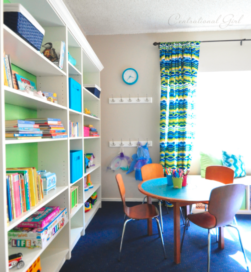 Last weekend design-savvy, DIY extraordinaire, Kate from Centsational Girl and her team of volunteers installed the playroom {and much more} for the Alma House Project. I had the pleasure of working with Kate on the initial design concepts for the room which flows openly from the kitchen. Kate envisioned a kid-friendly space that was colorful, multi-functional and provided loads of storage. We had to work with the existing navy carpet and ceiling, but every thing could be changed.