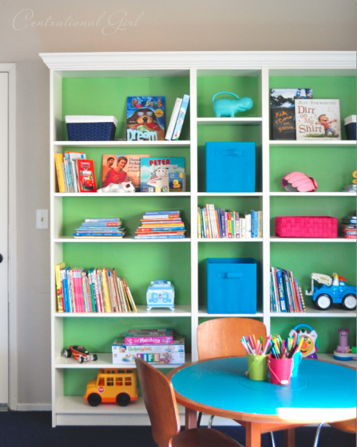 Kate worked her magic with a series of three Billy bookcases from Ikea. Love the “Green Lane” paint by Glidden she selected for the back of the bookcases. They look custom don’t you think? Here are the details on how she did it.