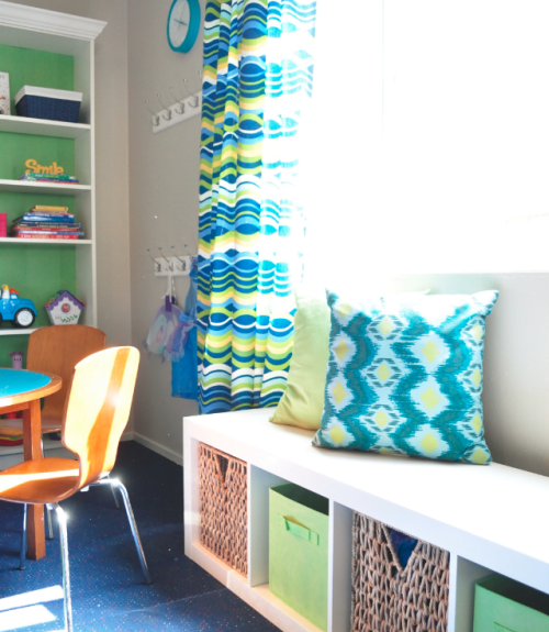 To create a window bench for reading and additional storage, an Ikea Expedit bookcase was placed horizontally. I love the ikat pillow Kate found that coordinates with the drapes so beautifully!