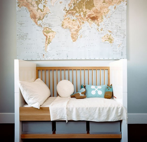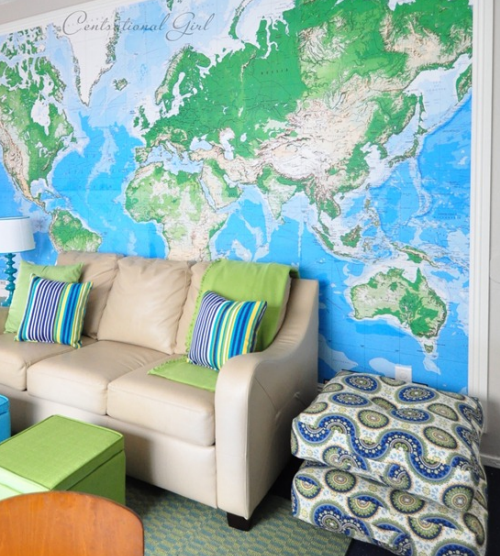 world map wallpaper on the wall opposite the window would make a huge impact in the space and work well with the existing carpet. Kate was on-board and the green and blue color scheme was set! Not only do maps help educate young ones about our world, but my hope too was that it allowed these children to dream beyond the walls of their home.