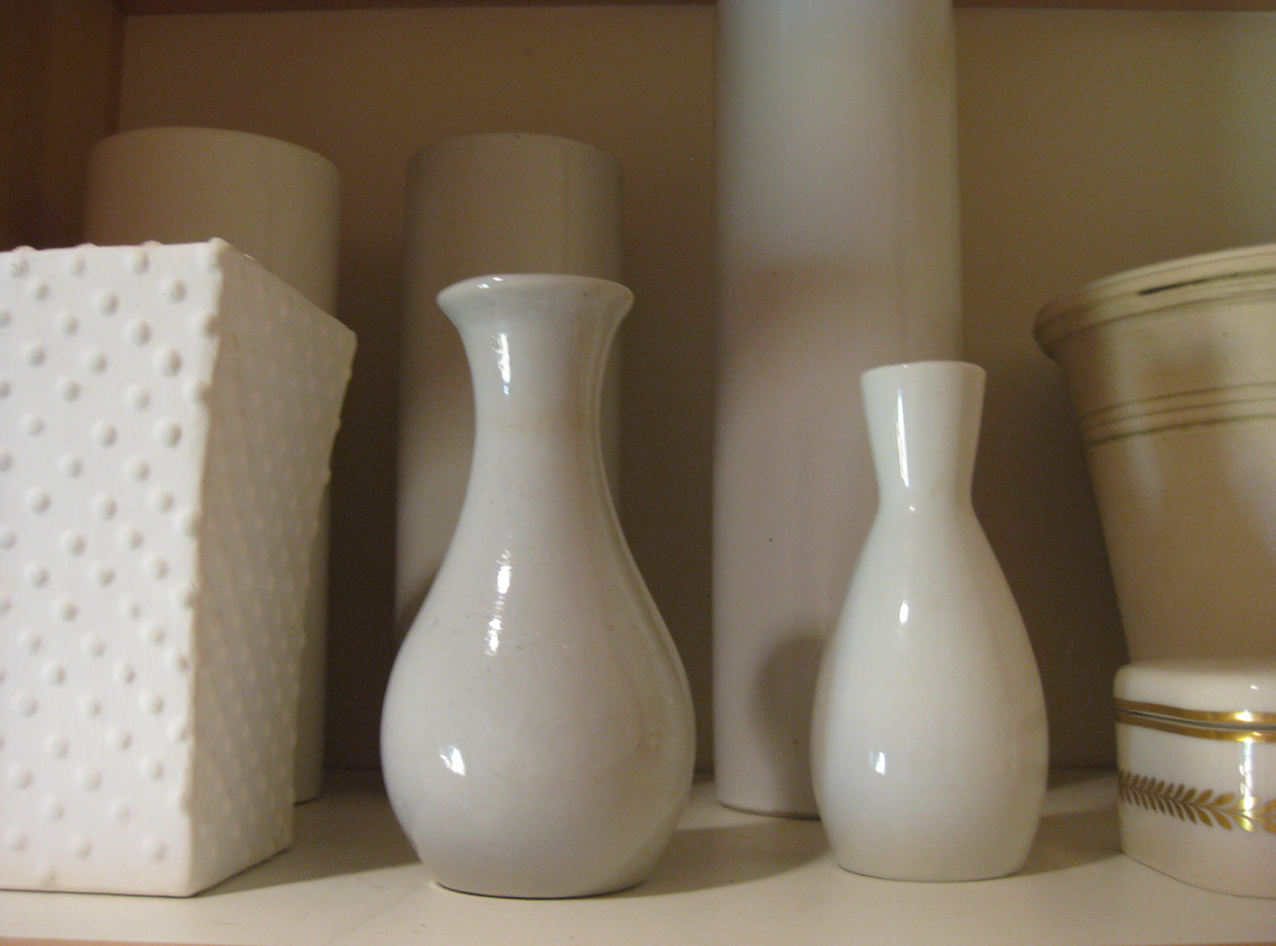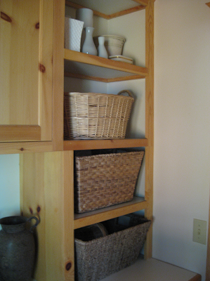 The homeowner had a lovely collection of white vases that I displayed on the top shelf. Organizing a collection of items by color is always easy on the eyes. It is also nice to have varying heights to add more visual interest.