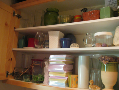 We even neatly organized all the cabinets. Here is a view of the cabinet above the sink before it was organized. It mainly served as storage for floral vases, so that is what ended up staying.