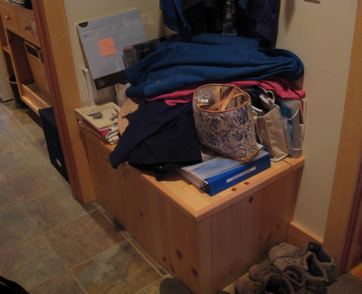Here’s the bench as it existed before organizing. The homeowners would use it as a catch all for items such as coats, books, bags and boots.