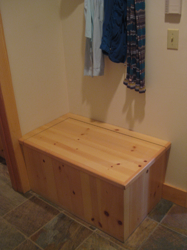 We found a proper home for all the items on the bench and left it free and clear of clutter. Now the homeowners can appreciate the beautiful custom knotty-pine built-in bench and retrieve items inside easily. And look, you can see the gorgeous slate floor!