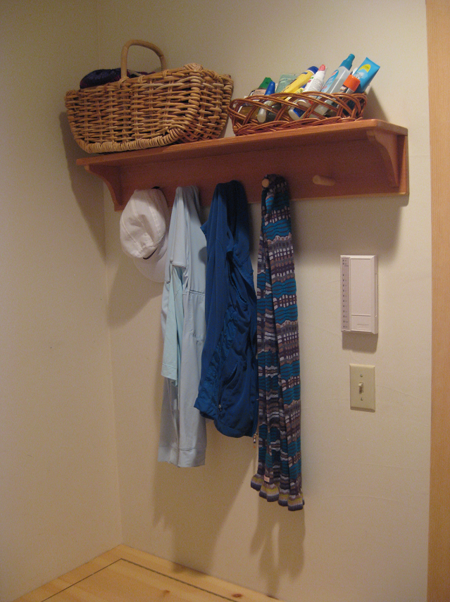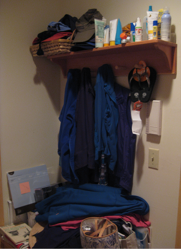 The picture above is a small space in between the garage and kitchen. As you can see, the coat rack and shelf are packed with items and very cluttered. It’s visually exhausting.
