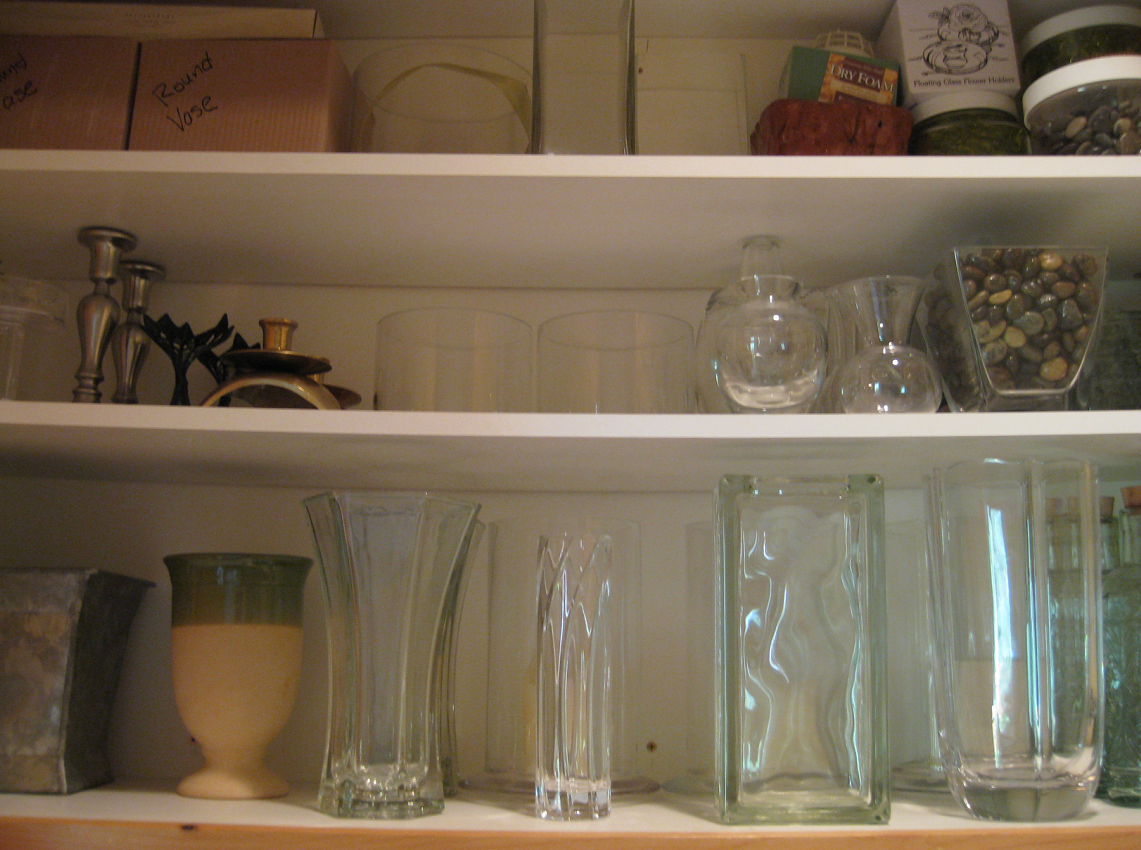 Here is the same cabinet after organizing. Now floral vases and supplies are displayed orderly and easily accessible.