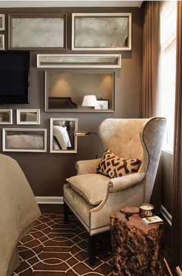 On the wall opposite the bed, Agins hangs a collection of mirrors that reflect city views. A cozy wing chair with nailhead detail by Victoria Hagan is placed in the corner next to a window. The tree stump side table brings organic elements to the space.