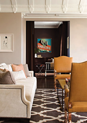 The living room is anchored by a chocolate, cream and gold Moorish-inspired area rug by Oscar de la Renta. The rug’s gold accents are beautifully picked up by the stunning mustard Portuguese armchairs from Heather & Company Antiques.