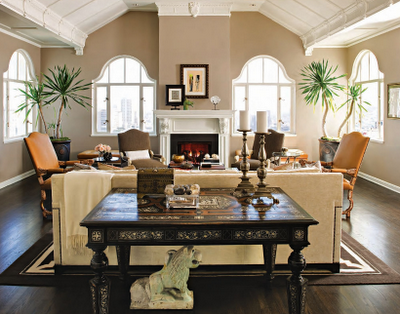 Here in the living room, Agins arranges the furniture to emphasis the room’s fireplace and mantel focal point by centering the Holly Hunt sofa directly across and lining armchairs on either side. This creates a cozy and inviting place for the mayor and his new wife, Jennifer Siebel to converse with guests. Not wanting to detract from the period architecture and breathtaking views, the elegant arched windows are kept bare. The asymmetrical decor on the fireplace mantel is beautifully done. It would have been a great example in my recent article, Tips on Decorating the Fireplace Mantel.