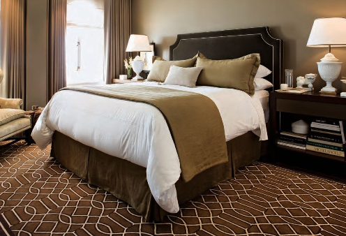 The warm and elegant master bedroom is gorgeous in a dark green color scheme. The area rug by Kelly Wearstler and the headboard with nailhead are my favorite elements in the space.