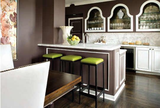 The small galley kitchen was opened up and modernized to accommodate large parties. Here is a view of the bar topped with Calcutta marble – it contrasts nicely with the rich brown walls and cabinetry. Agins brilliantly has the custom shelving behind the bar mimic the arched windows in the living room. The shelves are backed with mirrors – love this look!