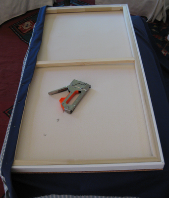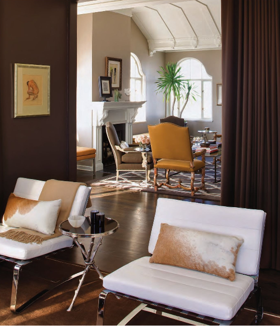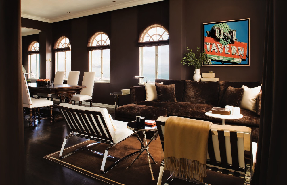 Here is a view of the media room from the living area. The dark chocolate-colored velvet Holly Hunt sofa and ottoman melt into the walls painted in Pratt & Lambert’s dark brown. The color scheme really allows the urban art to pop.