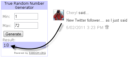 • Entry period closes at 9 pm PST on Monday, May 9, 2011. The winner will be chosen by Random.org.