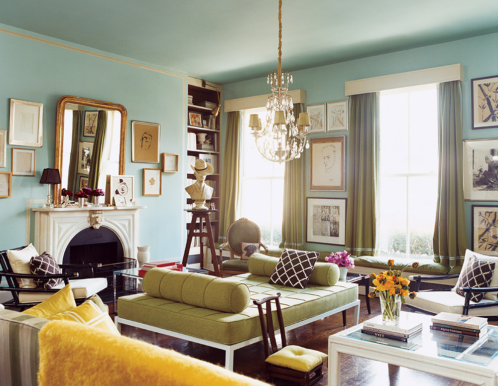 An old standby room, also from domino, the olive green curtains act as a neutral and help to keep the turquoise painted room sophisticated.