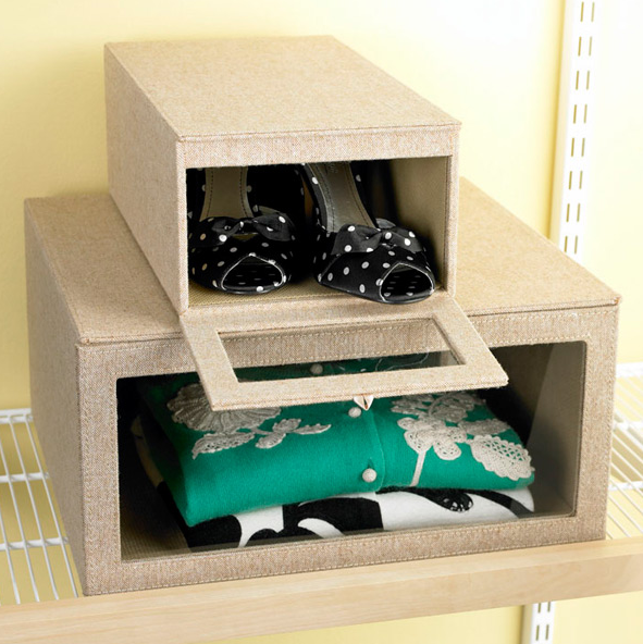 Function & Style. To help keep shirts, shoes and sweaters arranged neatly I recommend stackable boxes with clear fronts like these tweed drop-front boxes. The clear drop-front allows you see what’s inside and to access items without having to unstack them.