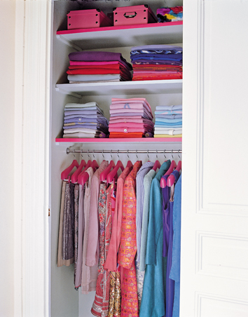Organize. If you have a large or walk-in closet it’s best to organize it into zones by season or garment type (i.e. work, casual, formal). Next arrange the clothing into sections for each category (i.e. blouses, dresses, pants, etc.). Then arrange the clothes in each section by color from left to right (i.e. black, blue, brown, red, orange, yellow, ivory and white). This makes it much easier to find outfits and is more pleasing to the eye. Wouldn’t you agree?