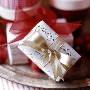A repeated holiday phrase in a script font becomes elegant packaging for small gifts. It’s simple, inexpensive and can be easily done at home with your computer and printer. Thanks Better Homes & Gardens!