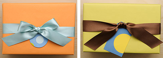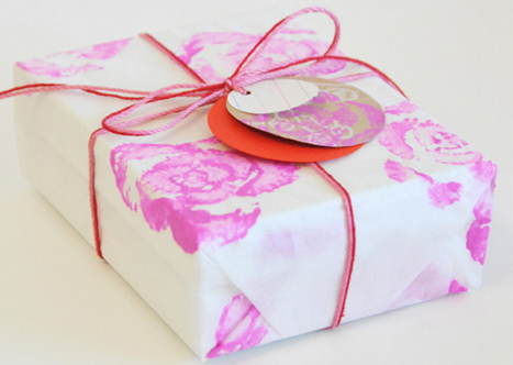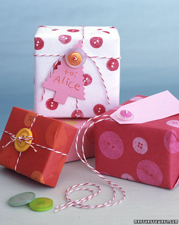 Here is another clever stamped gift wrap idea using buttons. To create a button stamp, Martha Stewart suggests affixing button to a cork with double-sided tape. Top the present with a pretty button tied on with baker’s twine.
