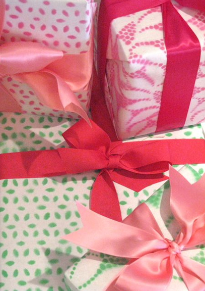 This spray painted lace wrapping paper by Eddie Ross is gorgeous and is a fraction of what hand block wrapping paper costs. Love the batik look.